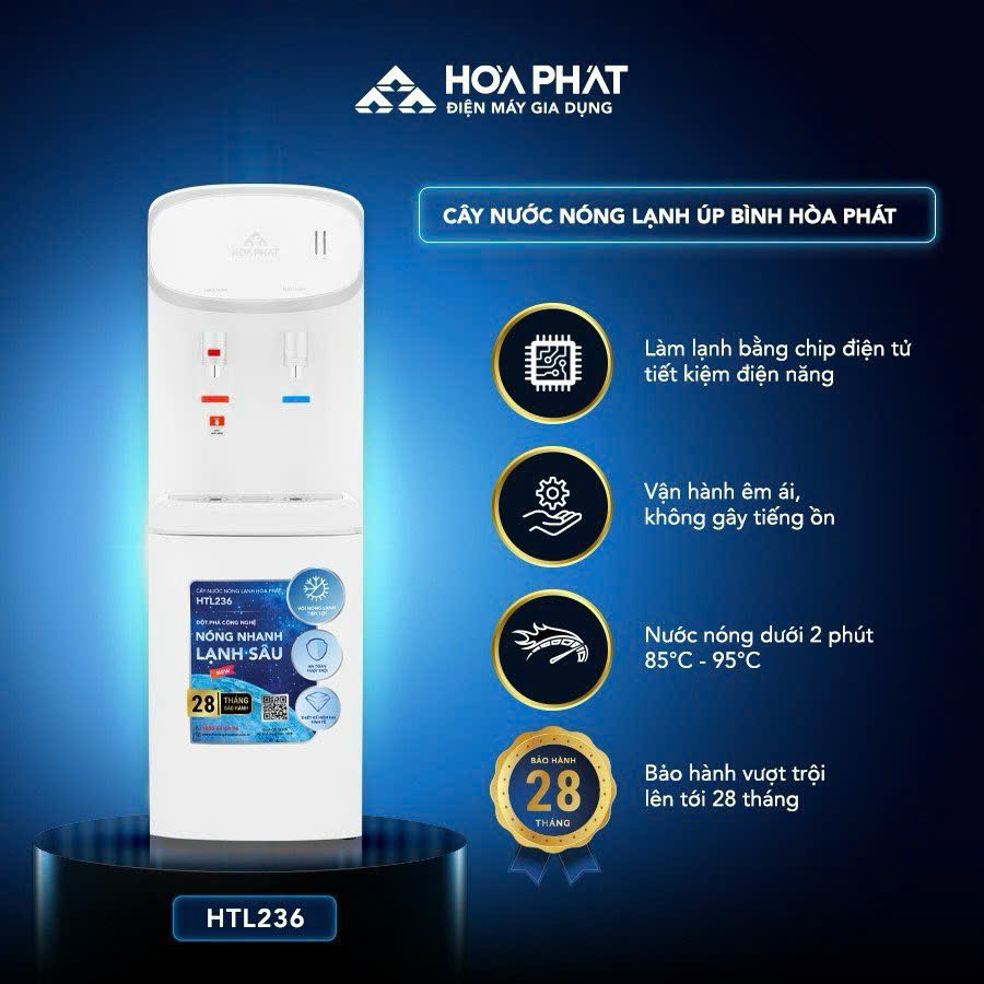 - Cây nước nóng lạnh Hòa Phát HTL236 là dòng sản phẩm trang bị công nghệ úp bình tiện lợi cùng mức giá không quá cao, giúp người sử dụng có thể thay thế dễ dàng, thích hợp cho gia đình, văn phòng, bệnh viện... Với thiết kế tủ đứng nhỏ gọn cùng vỏ máy bằng nhựa ABS siêu bền màu trắng nguyên khối cùng khung thép bền bỉ, sản phẩm đem lại sự sang trọng và thích hợp với mọi không gian trong ngôi nhà bạn.