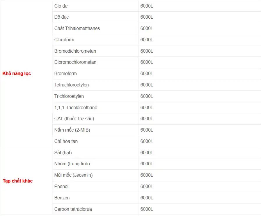 12 tháng (với lưu lượng nước sử dụng 15L/ngày tương đương 6000L) |