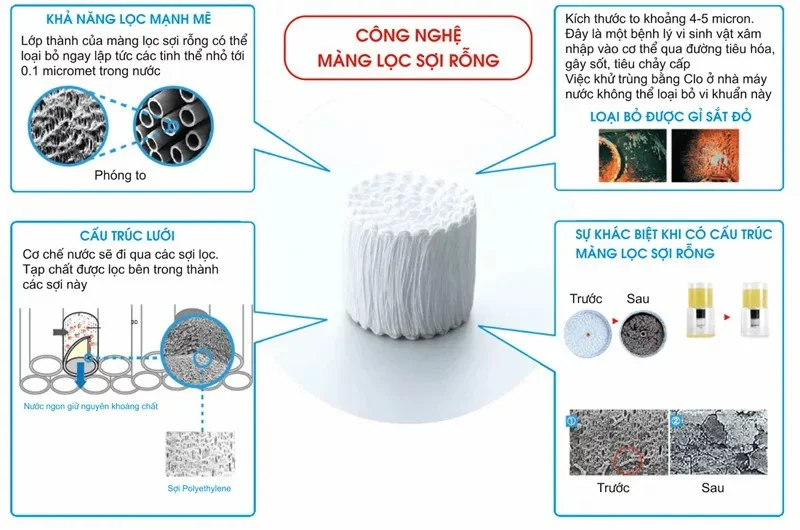 - Màng lọc sợi rỗng với những sợi dạng ống được đục lỗ siêu nhỏ, nước trước khi lọc sẽ chảy qua thành ống thông qua hàng triệu lỗ nhỏ với kích thước chỉ từ 0.01 – 0.1 micromet.
