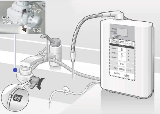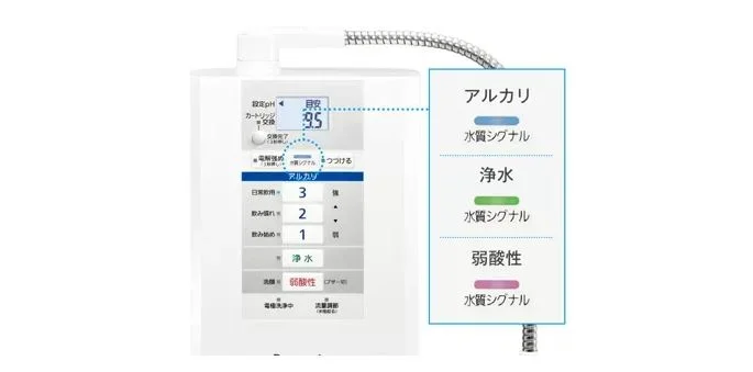 - Máy lọc nước điện giải ION Kiềm Panasonic TK-AS30 với màn hình LED, điều khiển cơ bằng nút bấm đồng thời trang bị đèn hiển thị tình trạng nước với màu sắc được thay đổi tùy thuộc vào loại nước được chọn.
