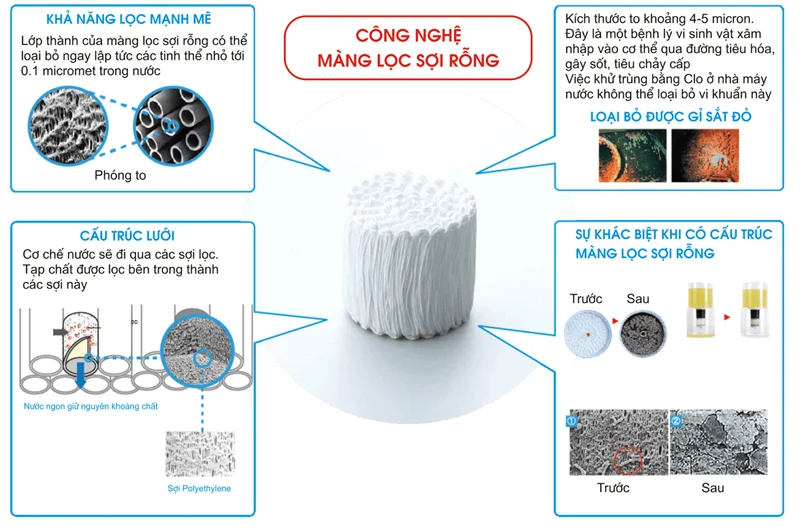 - Màng lọc sợi rỗng với những sợi dạng ống được đục lỗ siêu nhỏ, nước trước khi lọc sẽ chảy qua thành ống thông qua hàng triệu lỗ nhỏ với kích thước chỉ từ 0.01 - 0.1 micromet.