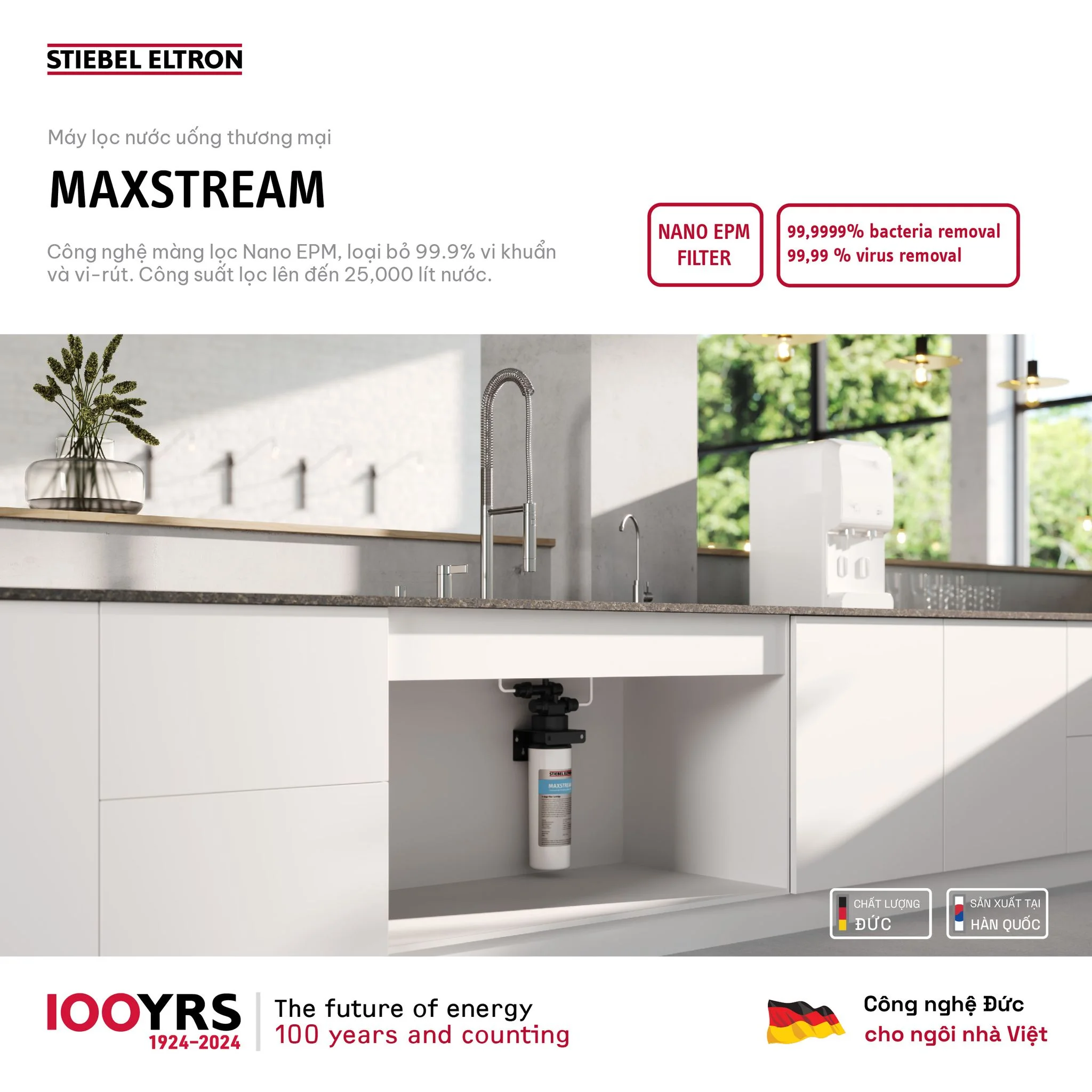 - Máy lọc nước Nano không dùng điện MAXSTREAM là dòng máy thương mại với thiết kế cực kỳ nhỏ gọn, có thể treo tường hoặc để gầm dưới tủ bếp, với kiểu lắp đặt "Plug and Play" (lắp vào là chạy) không dùng điện và không bình chứa. Đồng thời, thiết bị sử dụng công nghệ lọc Nano EPM giúp loại bỏ 99.9999% vi khuẩn và 99.99% virus mà không tạo ra nước thải, 4 cấp lọc giúp loại bỏ các hạt, cặn bẩn lớn hơn 5 micron và ngăn chặn sự phát triển của vi khuẩn,... Đồng thời với công suất lọc lên đến 340L/H, sản phẩm có thể đáp ứng mọi nhu cầu sử dụng nước suốt ngày dài và là thiết bị gia dụng nên có trong mỗi gia đình.