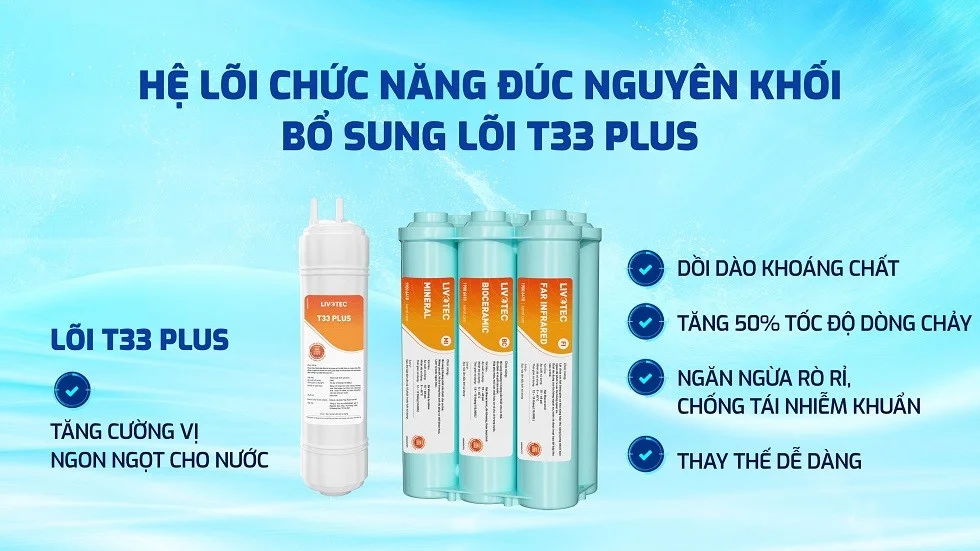 - Đồng thời, bổ sung thêm 1 lõi T33 Plus nhằm tăng cường vị ngon ngọt cho nước, phục vụ cho việc nấu ăn, giúp mỗi bữa ăn trở nên ngon miệng hơn.