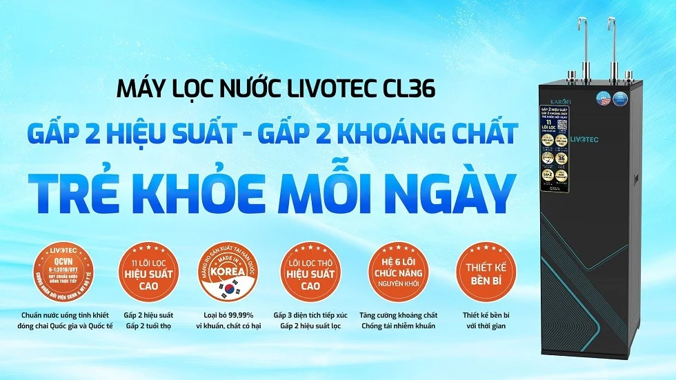 - Máy lọc nước Livotec CL36 được ra mắt năm 2024 thuộc dòng sản phẩm máy lọc nước RO với thiết kế tủ đứng nhỏ gọn, công suất lọc phù hợp với gia đình 4 - 5 người, đem đến nguồn nước lọc tinh khiết đủ chuẩn bảo vệ sức khỏe người sử dụng. Đặc biệt, CL36 có thiết kế 2 vòi nước riêng biệt phục vụ cho uống và nấu ăn, giúp cho mỗi bữa ăn trở nên ngon miệng hơn.