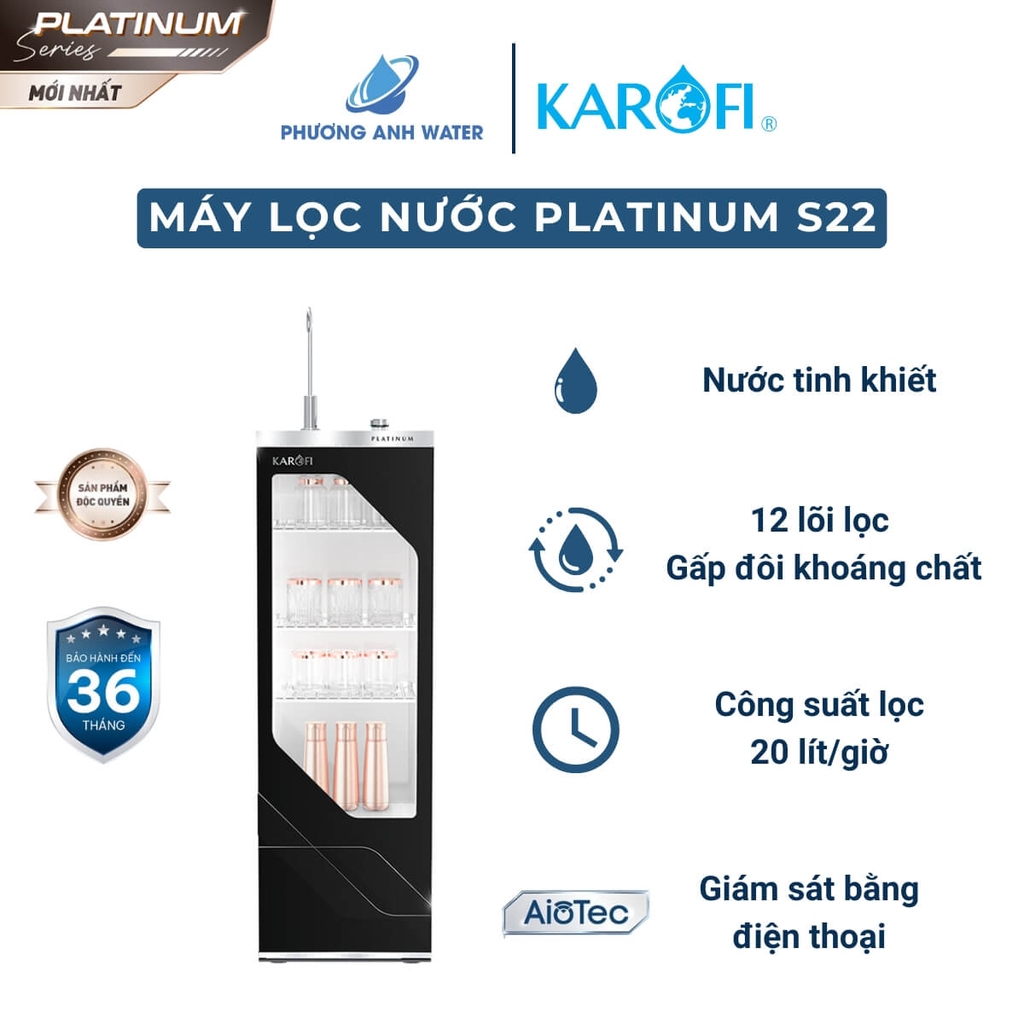 - Máy lọc nước RO Karofi PLATINUM S22 được tích hợp công nghệ thông minh thế hệ mới AIOTEC đem tới nhiều trải nghiệm. Công nghệ này giúp máy lọc nước PLATINUM S22 kết nối với smartphone thông qua ứng dụng Karofi 365 bằng Wifi.
